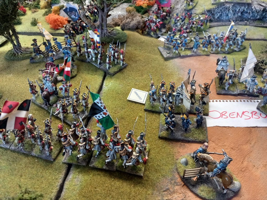 The early fighting was of course on the Obensburg and Cumberland the player sent messengers galloping off to the rear – he was told he had reserves, while he sent additional couriers to the grenadier battalions guarding his forward guns and to the brigade on the left of the line to turn to face. All of this of course took time even in wargaming terms and so he had to sweat it out and hope his jaegers and weak line held out.