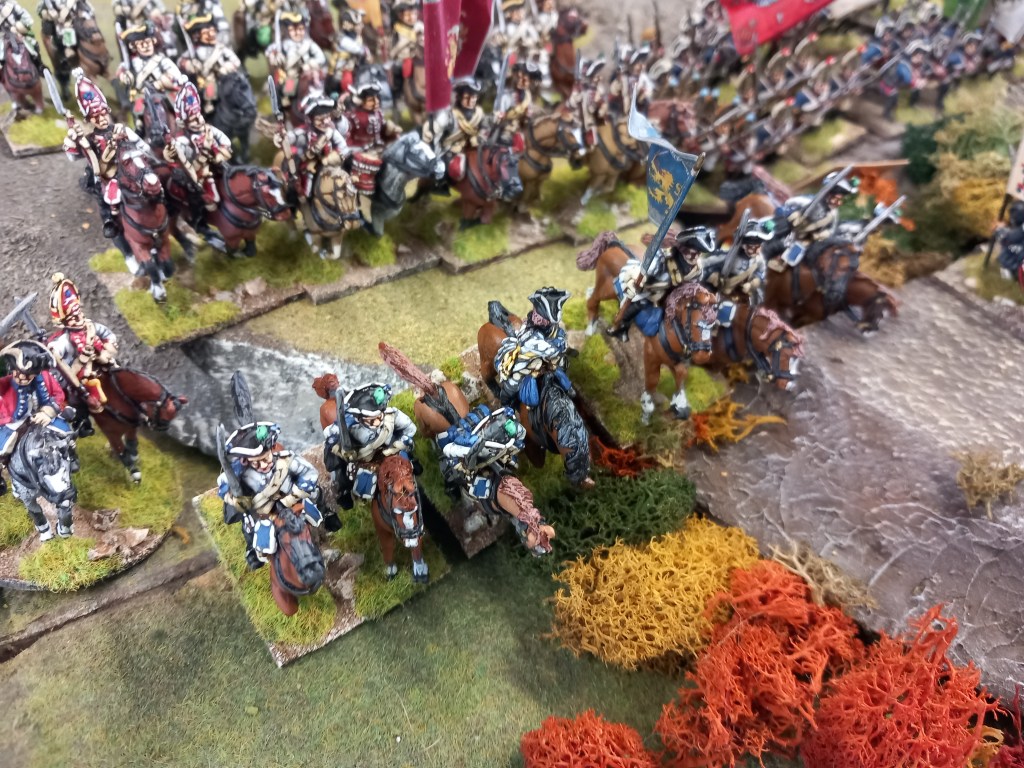 Over on the far right of the allied position the Hanoverian horse received orders to advance against the French left, mainly comprised of the grenadiers de Roi who had collapsed the Hessian line. Not the best of choices especially as this was the signal for the opposing French horse to respond.