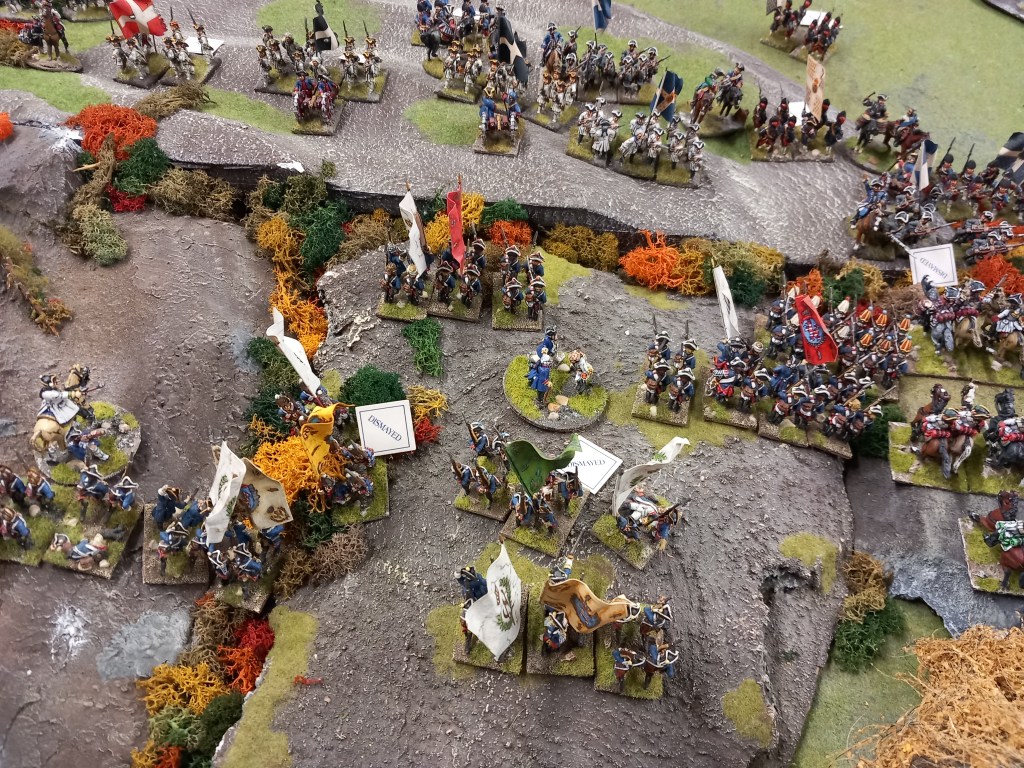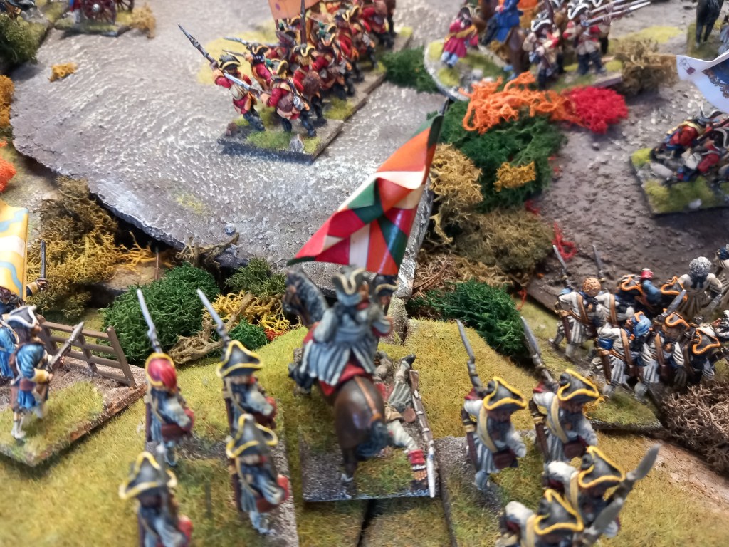 The high water mark of the French attack, left centre. The Hessian brigades have failed their morale checks, several battalions have virtually ceased to exist and their cavalry had been halted by musket fire, the best they could do now was cover a retreat. The French facing them are only slightly better off, the Grenadiers de Roi battalion are spent but the Grenadiers Royaux are in decent enough shape to occupy the crest and there are plenty of cavalry following on behind.