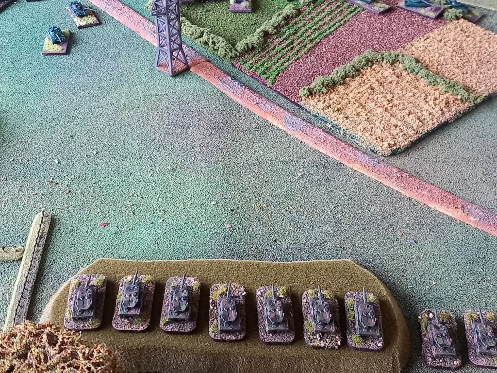 The Soviet player initially advanced on a broad front which we soon realised was a mistake as it meant that a single Soviet tank battalion would end up facing off to more powerful and flexible NATO battalion which in the battle of the armour would be death for the Soviets. In terms of shooting the rules are brutal!