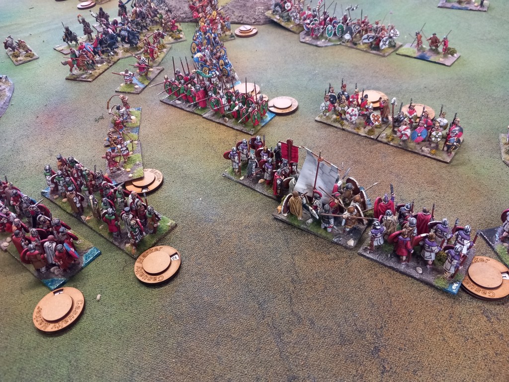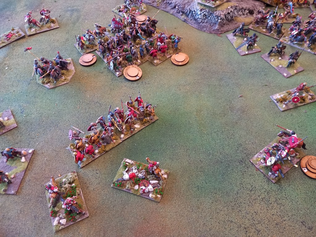 A general advance by both sides occupied the first couple of turns and then first blood was tasted by one of the Equites Superior regiments under Gerontius who smashed into the lead Burgundian warband and sent it rolling back where it came from. An unexpected result that left a bit of a hole in the Constantine left flank – in fairness all the odds were with the cavalry and they rolled incredibly well.
