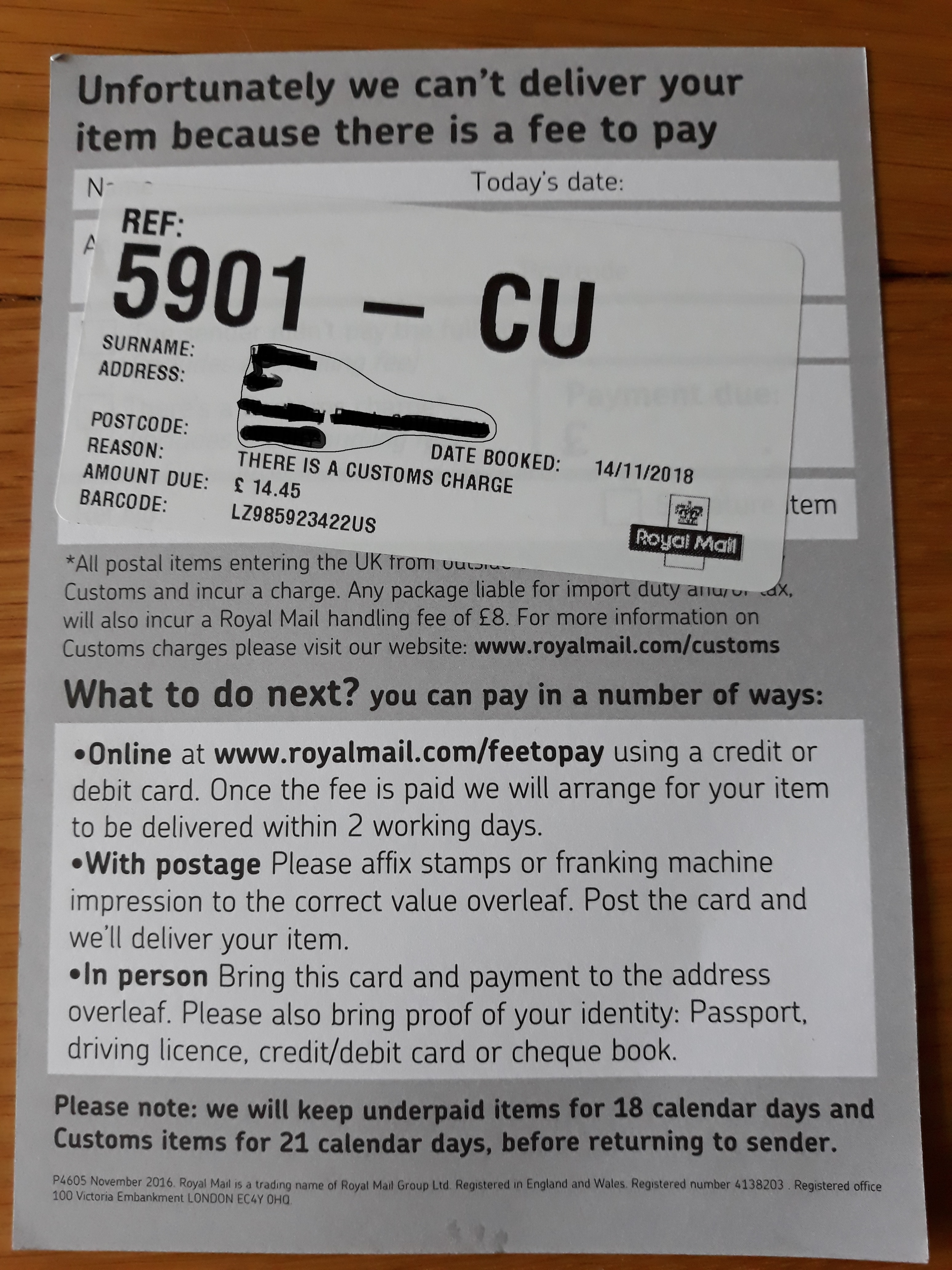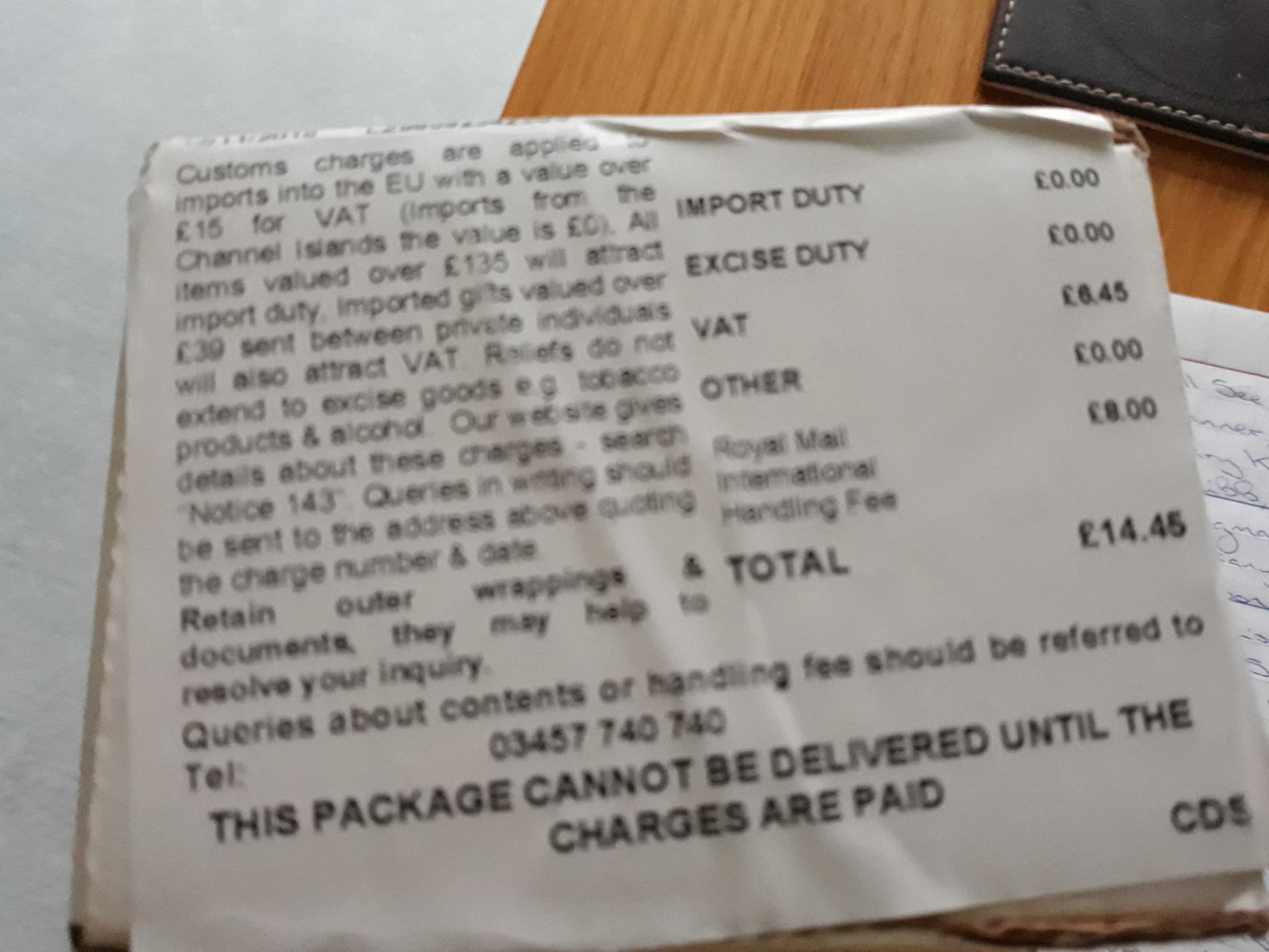 Package duly arrived but rather than the package I got a note through the door saying I had customs duty to pay, £14.45 in fact. What?