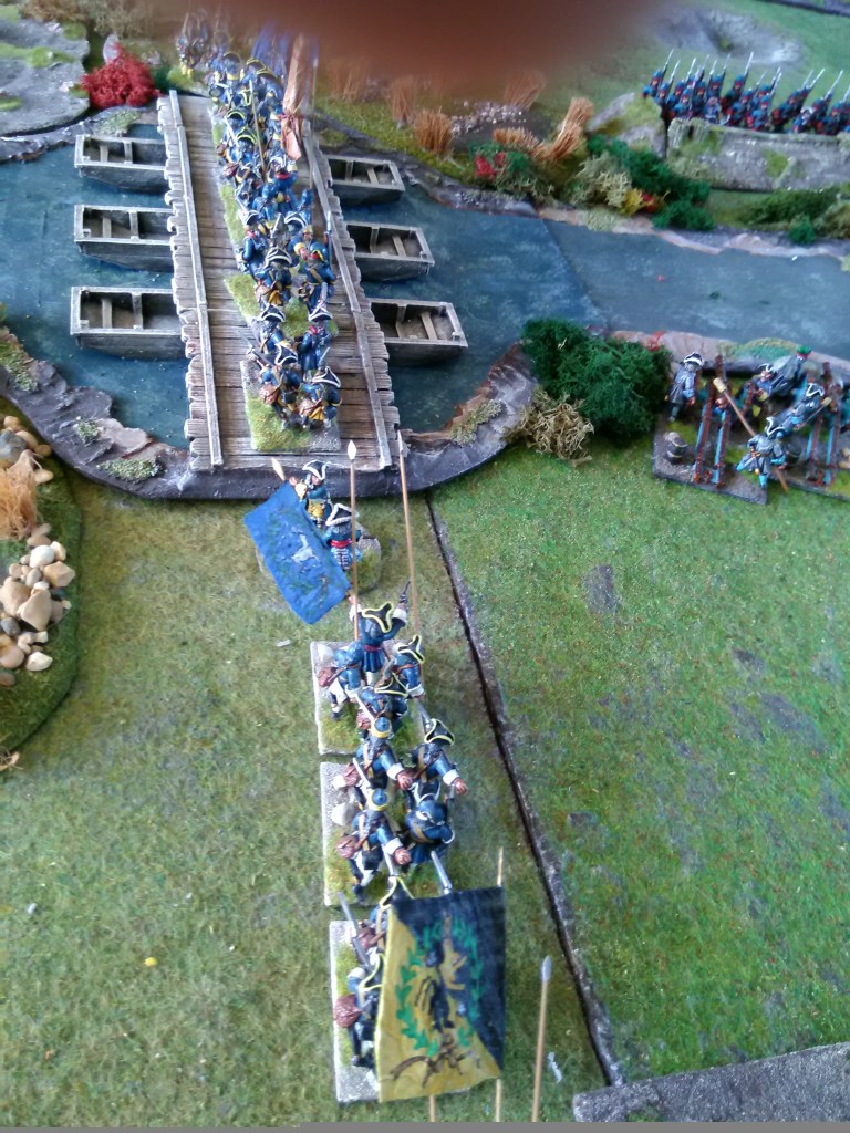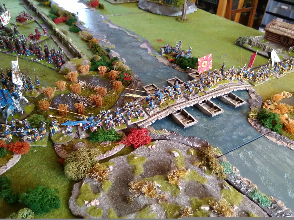 Our thinking with the Russians was that Repnin’s 2 big brigades would be positioned facing out across the river and wouldn’t start responding until the Swedes emerged from the marsh and then only the brigade that could see them (Schweden). The reinforcing cavalry and infantry could only be activated by Repnin finding out from Schweden that they were under attack and sending a message off to Goltz who would then roll a D6 for the number of turns after receipt for when he could start to emerge, said messenger would then carry on to Renne to release his infantry using the same process. The process was made deliberately slow (wargamers are very good at responding to things they can’t see unless you stop them ๐Ÿ˜‰) which is just as well because both reinforcement commands rolled a 1! Deploying the Swedes was more straight forward as they only had one route so we strung out the infantry battalions, led by the Guard, all the way from the table edge, across the pontoons and into the marsh with the 1st Guards on the edge of the marsh, somewhat disorganised, ready to go; this signalled the start of turn 1. As a side note, the Swedes, for once, out gunned the Russians so we placed some regimental guns next to the crossing point to fire in support and some big field guns on a low hill to pound the entrenched Russians, the Russians only had regimental guns strung out along the line.