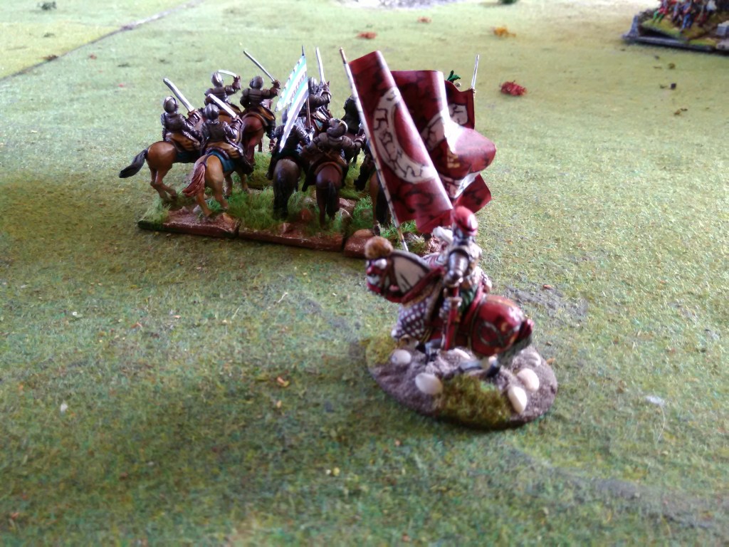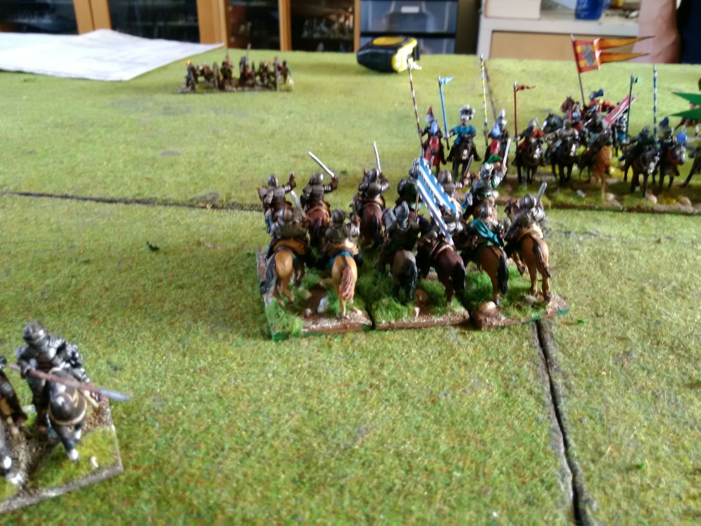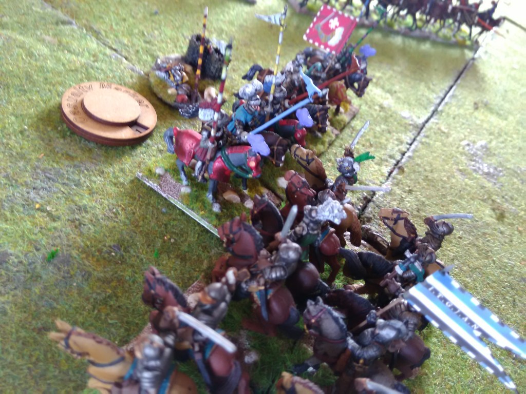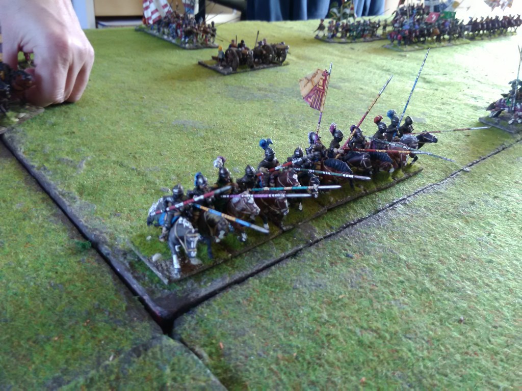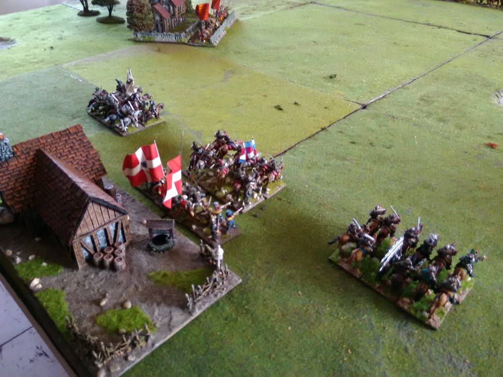 How did it go? Well the Royalist commander played a cagey game using his points to move bits of the army at a time to try and get a more co-ordinated attack in while the artillery pounded away at Genlis (very historical π); on the flanks he used his infantry to advance on the villages (we didn’t hide the arquebusiers) which took quite some time but of course the cavalry did have to move if any progress was going to be made. The Huguenots stood still so quite a few turns were just the Royalists moving and the artillery firing.