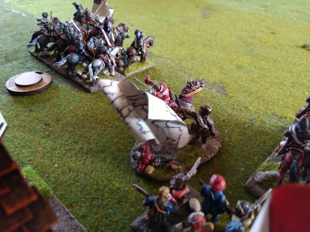 As the Royalists eased their way forward Francois Montmorency’s cavalry took the first lots of harquebus fire but morale held (naturally π) and the colonel wasn’t hit – each unit has a nominated colonel with a skill rating that helps in any testing but can be a casualty based on the number of casualties received. The Royalist artillery fire was particularly accurate on this day and after a few turns of casualties Genlis moved his cavalry into the shadow of Aubervilliers to avoid further losses which caused the Huguenots to advance their rear-guard pike into the space who also fell back due to the artillery – it was temporary, they soon resumed their spirit.
