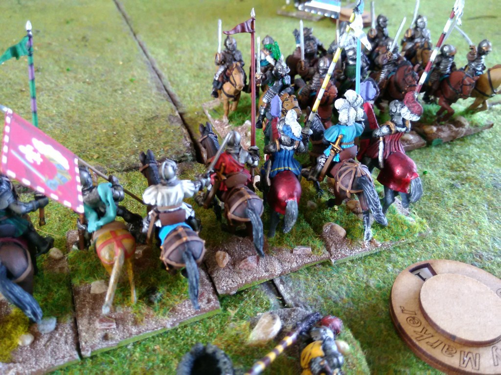 With the Royalists now getting closer Coligny & Conde manoeuvred to try and get into a good position to take on the most forward gendarmes of Montmorency (junior) and Cosse – turns are alternate where players dice for initiative, so there is a certain amount of risk in gambling you will get the next initiative for things like charging home. The Huguenot arquebusiers were now starting to rack up some losses on Montmorency & Cosse which favoured Coligny & Conde going in and when the arquebusiers in Ouen were distracted by an attack by the Paris militia – performing far better than their historical counterparts even with reduced stats, Coligny decided now was his time.