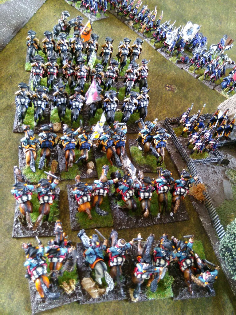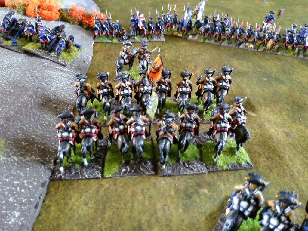 The battle, in brief, consisted of an early morning artillery duel which inflicted some serious losses on the static Prussian infantry and some losses on the Austrian cavalry manoeuvring on the plain. Battle proper started with the Prussian left wing infantry under Bevern ascending the Lobosch and engaging in what turned out to be a day long musketry duel with Lacy which finally turned in favour of the Prussians. On the valley floor Kyau’s cavalry brigade, which included the Garde du Corps and the Gendarmes, galloped confidently forward and got their arses handed to them by the hidden guns and muskets. The remnants joined the main cavalry body and the whole lot then attacked without orders! half of them got into the sunken road but where seen off by a counter attack by Austrian cuirassiers and the other half ended up stuck in the Morellen Bach where they were easily shot down. After the cavalry debacle Frederick left the battle (again!) leaving Ferdinand of Brunswick to direct the main infantry attack which eventually convinced the Austrians to relinquish the now burning town in the late afternoon. Frederick claimed victory by dint of the fact that he was master of the field (even though he personally wasn’t there!) although von Browne had in fact achieved his aim, the main army marched successfully behind Lobositz and across the Elbe. Losses were about even.