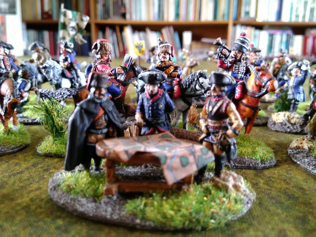 For our refight we mainly relied on Christopher Duffy’s ‘Frederick The Great. A Military Life.’ plus a couple of articles of refights from ‘Battle’ (Charles Grant on matters military) and ‘Practical Wargamer’ (Paul Stevenson’s ‘A Bohemian Rhapsody In Fifteen’). Using Duffy’s map we had enough battalions and regiments to match the numbers although not necessarily the specific units – we didn’t have the Garde du Corps or Gendarmes for example and we reckoned that as long as we had enough Austrian units to line the Morellen Bach that would be enough as most of the main Austrian body took no part in the battle. Regarding the terrain we had a large ridge section that stood in for the Lobosch rather well, the marshy stream was no problem nor was the town itself and the nearby villages of Wellhotta and Sullowitz; the sunken road we created using our TYW siege line pieces.