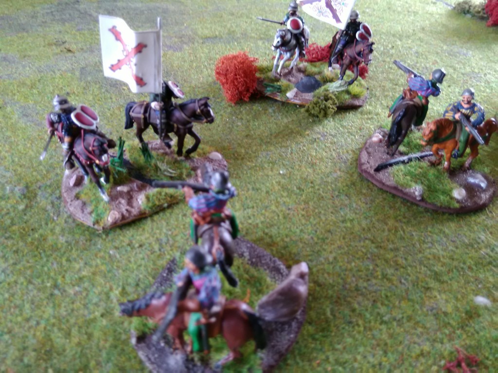 On the French right, Urbino decided to use his points to get his crossbowmen forward to maybe shoot the Swiss attack in by clearing the Imperial skirmishers out from where they had jumped into the sunken road which they were using as a trench (sneaky!) – in the long run this kind of worked in that the skirmishers in front of the manor house were eliminated but it didn’t do much to help the Swiss. On the French left, Lescun duly advanced but Sforza decided to come and meet him and use his crossbowmen to wear down the Gendarmes – it took a while for Sforza to convince his mercenaries to get moving and their firepower wasn’t that effective but they did managed to kill Ponteformy which stopped his company (rules note, no Captain, no move).