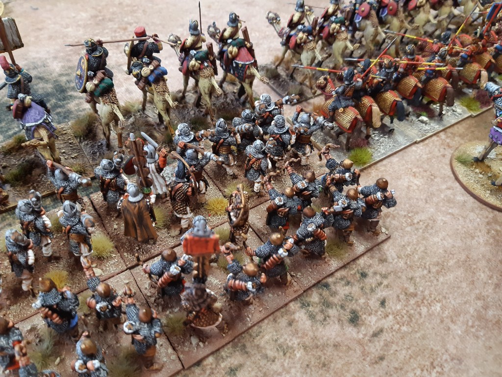 In short; after my disaster with the camels the right wing redeemed itself (led by the cataphracts) and ultimately broke their opponents and headed for the enemy camp which they duly looted, the left duked it out inconsequentially but it was in the centre where victory was clinched because as Severus looked on as his praetorians slowly pushed my legions back an ignored auxilary archer unit emerged from broken ground and killed the emperor in a volley of arrows! My thanks to Gareth for gentlemanly pointing out I could do this, I had just assumed you could only shoot units 😁.