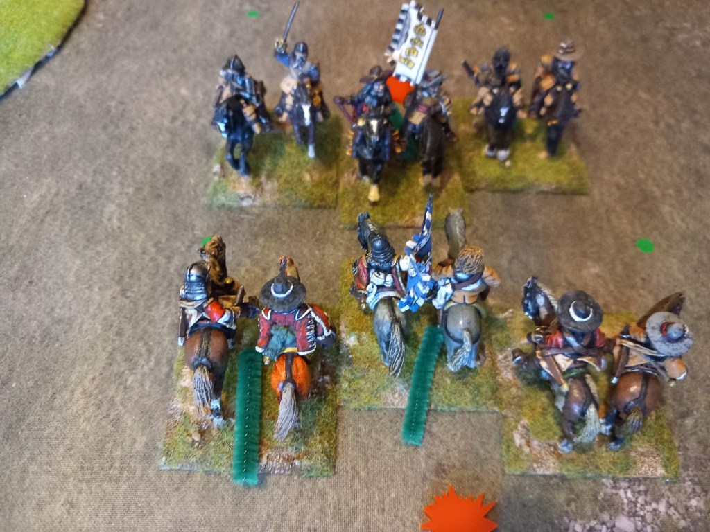 In our refight the Royalists were far better organised and managed to advance their whole cavalry line forward (more or less) – the rules restrict the number of units that can action to the skill rating of the commanders of the battailles.