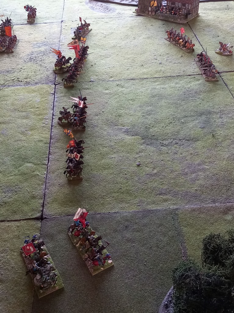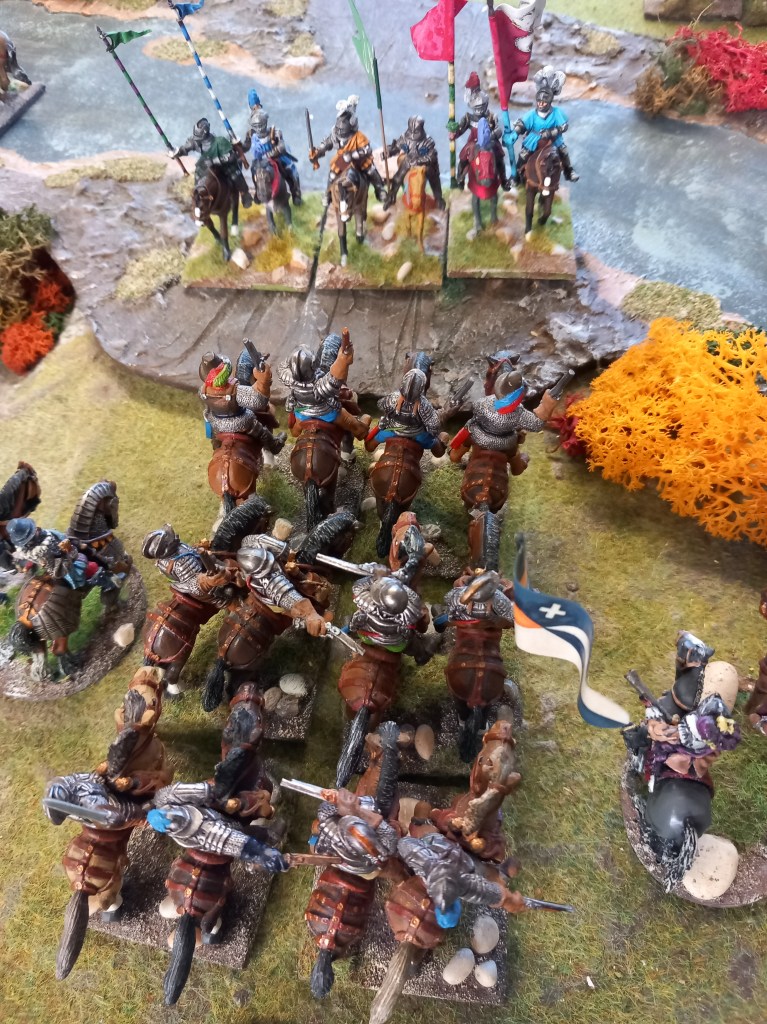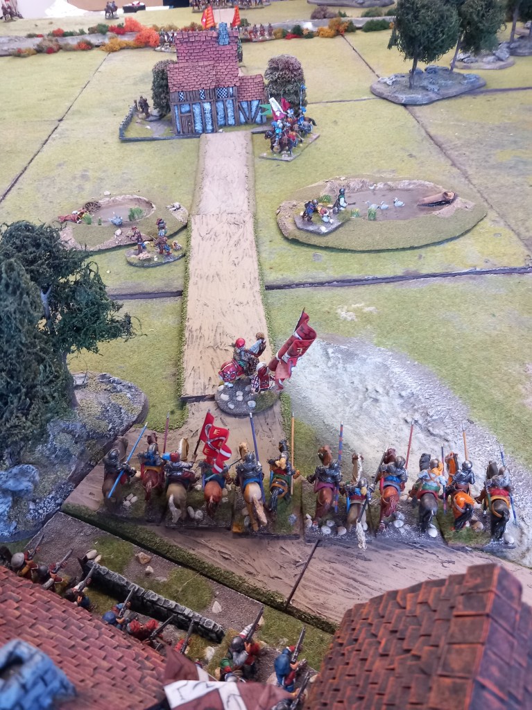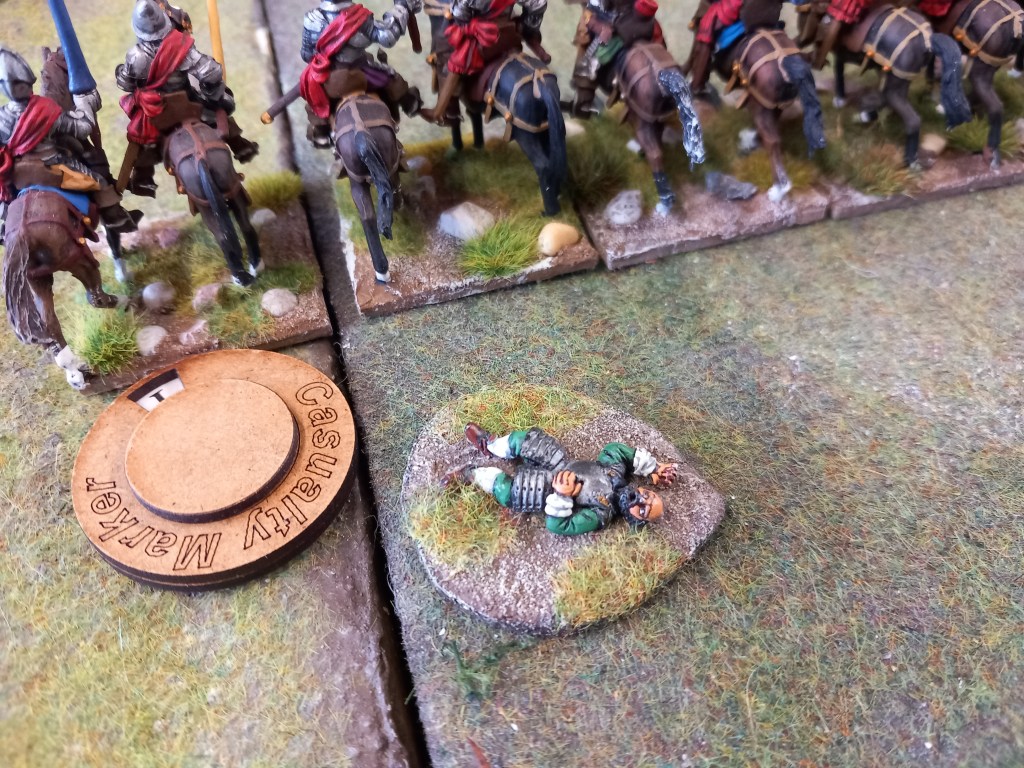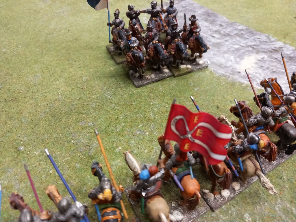 The opening moves didn’t go well for the royalists; the Huguenots used some of the enfant perdus defending the ponds to take pot shots at their cavalry and managed to shoot oth Montpensier and d’Anjou out of the saddle essentially halting those units for a brief while and buying the Huguenots time – they were very lucky shots!
