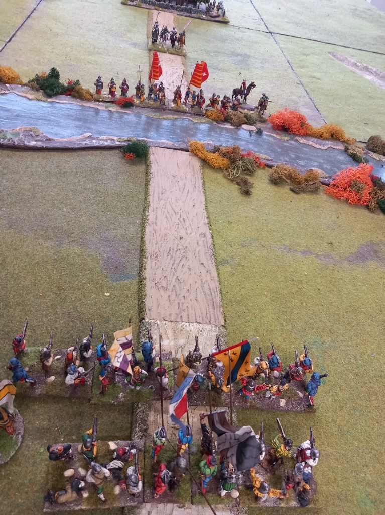 Our refight was as close as we could get to the small numbers of the original. A regiment of Huguenot shot defended the stream facing off to twice their number advancing on them. Behind them were a couple of cornettes of cavalry, then a village with enfants perdus, then some more cornettes, then the last village with a full body or horse and foot. Besides the foot facing across the stream the Royalists had a body of horse poised at the designated crossing point and then 3 regiments of reiters ready follow on at a predetermined point but who might arrive early on a random die roll – they didn’t.