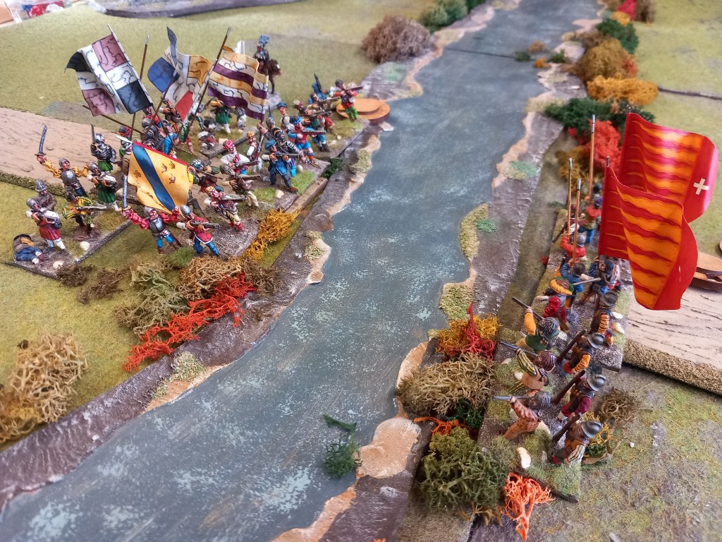 At the stream de la Noue is reinforced by d’Andelot. Who will prevail, lance or pistol?