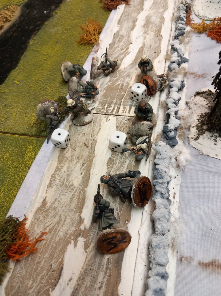 The German advance down the road nearly worked except that as a last minute deployment whim the American player had deployed a sergeant with a Thompson forward in a stand of trees mainly to observe and what a gift a column of infantry presented. Merry Christmas!