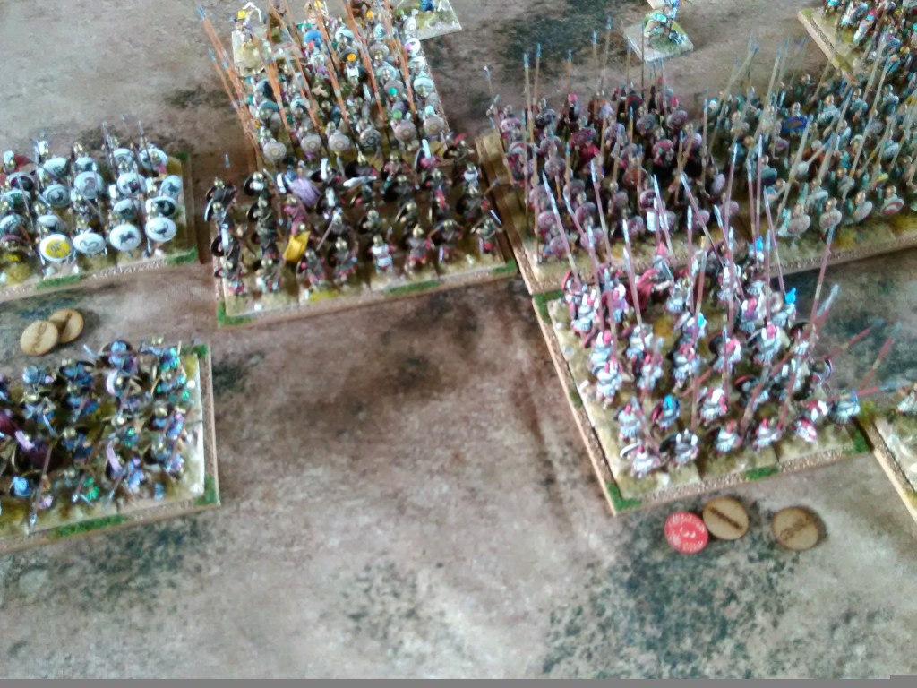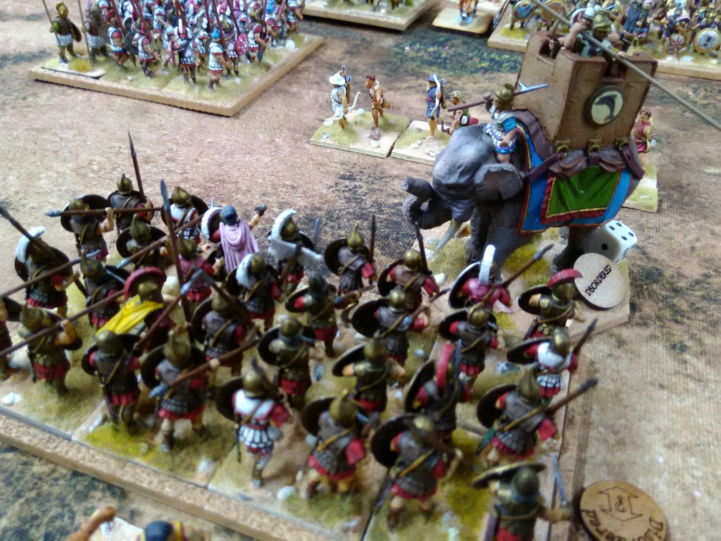 Once the basic building blocks were established the rest of the prerequisites to play soon fell into place; there is hardly any armour so you either are or you aren’t, weapons are pretty standard, only the infantry have shields, there are shock cavalry and skirmish cavalry, there are melee infantry and skirmish infantry, so with the skirmishers it was just less figures on a base which did lead me to having the standard skirmish cavalry base as double sized – 1 figure on a base looked silly. I did however succumb to the non historical, purely wargaming formation, of Loosely Formed Infantry to represent peltasts and warbands; everyone knows there is no such formation really but it is a convenient conceit. The range of morale (or bravery or class or whatever you want to call it) seems pretty limited, there are elites and veterans, a whole load of mercenaries who are generally pretty reliable, a goodly number of levy who aren’t so reliable and the great bulk of the armies who are just that, the steady eddies who turned up, fought and died; I opted not to do a ranked hierarchy or stats but instead built in advantages and disadvantages for the various types in different situations. The one thing I did realise, and have tried to build in, is the effect of leaders; none of them are crap, most are pretty effective and some are downright amazing in the right circumstances, so again I’ve built in advantages in certain situations – Pyrrhus, for example, would be classed as ‘Daredevil’ which gives a decided advantage if he’s in the front rank of a unit when they are attempting to charge and when fighting their first round of combat but of course he is at a greater risk of being killed (although nobody is throwing tiles off a roof!). In a moment of madness I did come up with the idea of listing every leader from the period on a spread sheet and ranking them according to what I could find out about them, then ‘costing’ them in the army lists against the armies they could serve with; I actually got a a fair way through this with notes all over the desk and a pounding headache before I thought “what the hell am I doing, I promised Dave this would be straight forward” binned the lot, headache went away 🙂