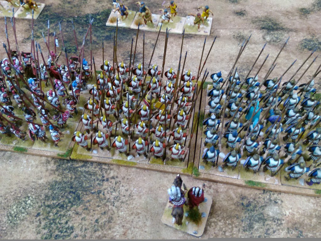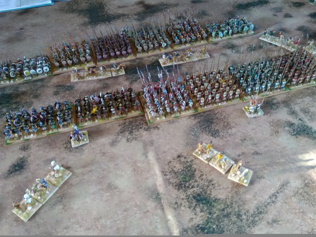 The Antigonids deployed with the pikes in the centre, flanked either side by the hoplites and covered by the skirmishers, all commanded by the General, two elephants protected the right flank of the infantry block and one the left. On either flank were the cavalry, two units per command under a commander each, with the right wing being the stronger, quality wise, as it contained the Xystophoroi.