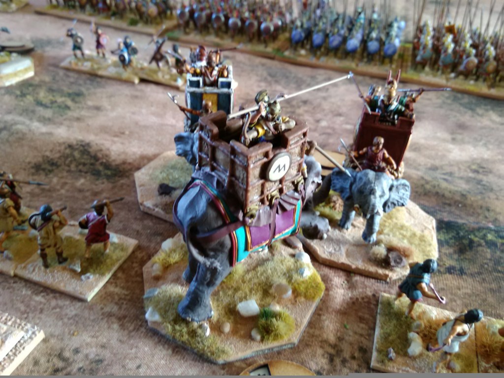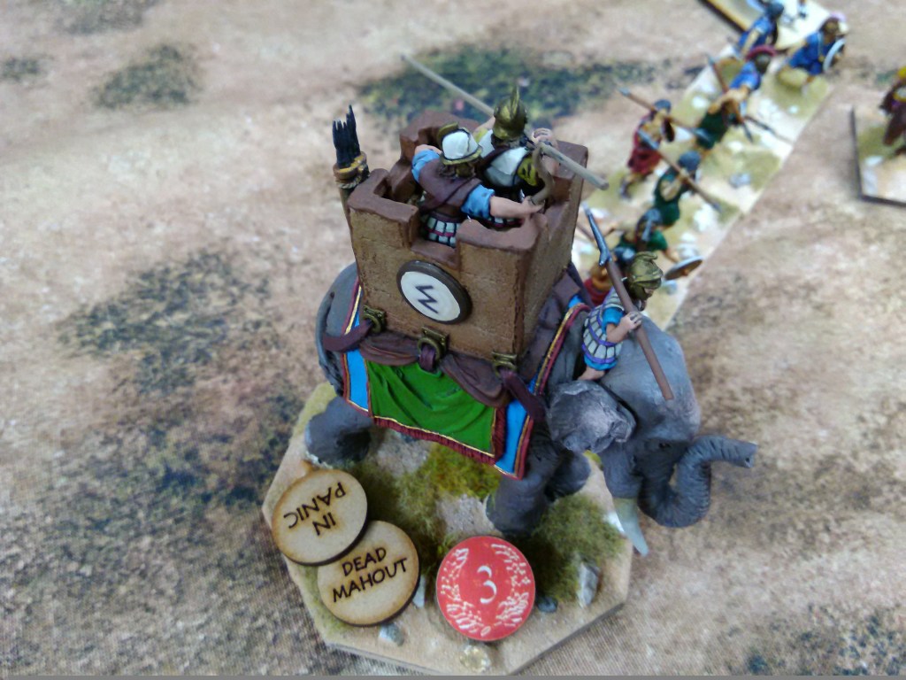 How well elephants would perform was a worry when I was writing and play testing the rules solo and so I was keen to see how we got on here. Overall I was pretty pleased; on the Antigonid left the single elephant acted as a disordering deterrent long enough for the left hoplites to turn and face and the javelin skirmishers to screen them; this elephant could in fact have charged and caused a bit of a mess but the afore mentioned distraction of lapsing into another rule set sequence briefly meant that the opportunity was lost 😥. On the Antigonid right the fun I wanted from the elephants paid off in full; both sides had an elephant go into panic due to the loss of the mahout from shooting, the Eumenid one careered about randomly as per the rules but the Antigonid one ran straight into it’s own hoplites who then spent the rest of the game trying to kill it – just what I wanted 😀. The other two elephants ended up in a melee when the Eumenid one charged home and they were still fighting when we called time.