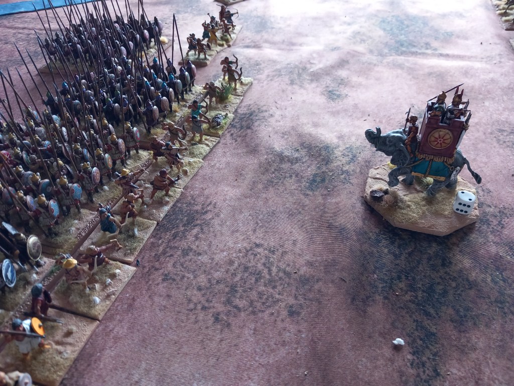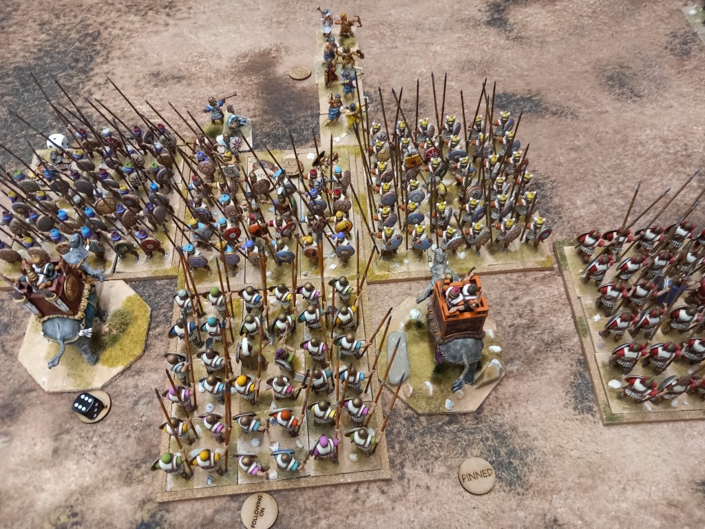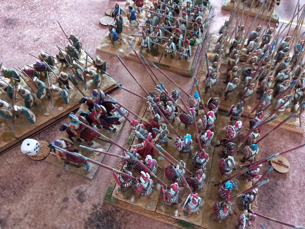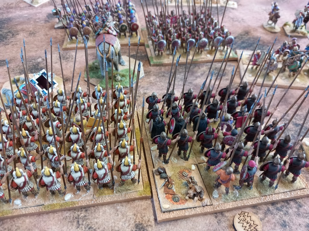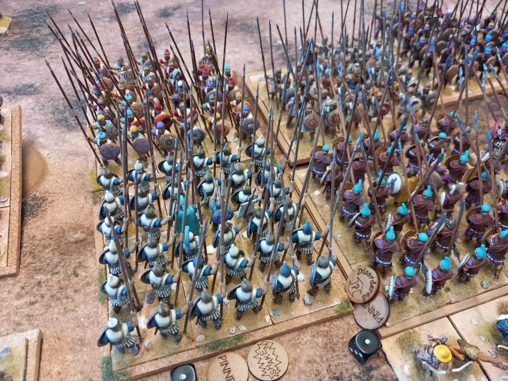As always the initial action was on the wings where on one flank the Romans killed the elephant and then ran into the veteran pikes and died horribly and on the other where the cavalry on cavalry fight saw the Roman commander killed and that command halt paralysed.