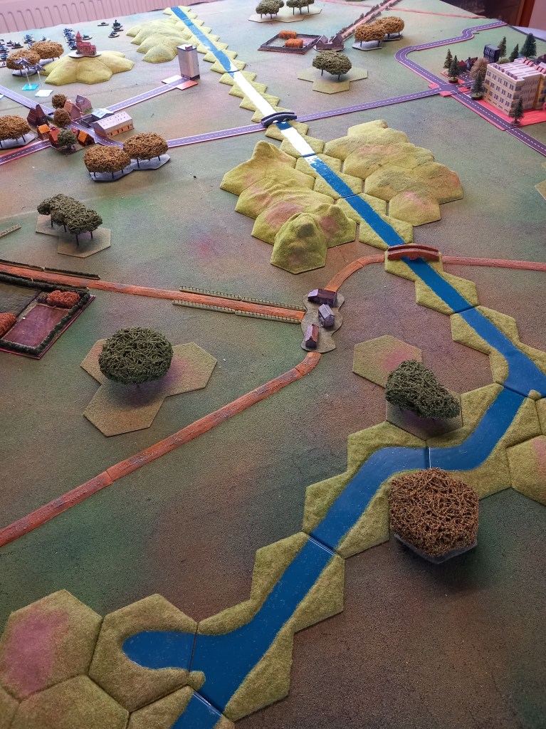But in a bold move the Bundeswehr player stormed the suspension bridge (see previous photo) and the game changed. The Soviet flank was turned so they were scrambling all their battalions to face off to the Germans and the surprised Germans (I don’t think they thought the attack would really work) were throwing everything towards the bridge.