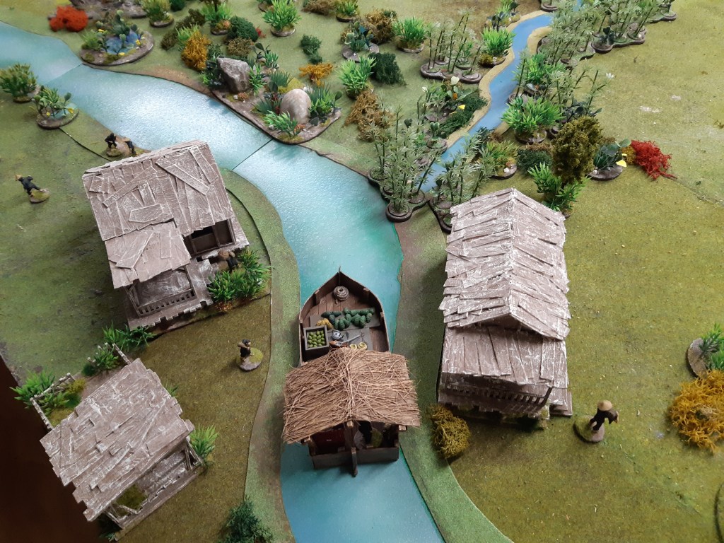 Our scenario saw the peaceful village of Cho Ra going about it’s business under the benevolent/oppressive eye (delete as appropriate) of the French protective/occupation forces (delete ….) located in two nearby compounds. The village was located at the northern end of the table at the confluence of a river and stream, the stream could be crossed without any major difficulty but the river would have to be swum. The two compounds were located south of the village on either side of the stream, the eastern compound housed a single squad from 1/4 RTM (Moroccans) and the western compound housed a single squad from 1/2REI (Foreign Legionnaires); there was no support weapons or contact with artillery/air cover, and any reinforcements would be in response to flares or runners. The Legionnaires were Veteran & Cadres (averages in normal parlance), 12 men strong armed with rifles, smg’s and one lmg, the Moroccans had two Veteran sergeants (one Moroccan, one French) armed with smg’s and the rest Cadre with a couple of Recruits, 10 men with rifles and an lmg.