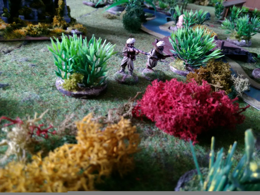 To start the game the French had to occupy the compounds but could also spread out across any the playing area and would deploy first. The Moroccans opted to place the lmg team in the edge of the jungle covering the footbridge over the stream near their compound and send a two man patrol out south from the bridge along the cleared ground, the remainder of the squad manned the compound including the all important watch tower. The Legionnaires deployed a three man patrol at the most southerly end of the track heading back toward the two Moroccans, the rest manned the compound. The Viet Minh had 6 jump off points placed around the gaming area by the umpire (visible to all) and 6 counters each marked with a squad designation or the designation ‘dummy’ which they could place at any of the jump off points, but only one per jump off, these would then be moved as play progressed until they revealed themselves or they were spotted. The Viet Minh players opted to have the two assault squads on the northerly jump off points in the jungle near the river on either side of the stream, the support squad was in the south west jungle and the HQ at one of the temple ruins in the western jungle. The Viet Minh plan was simple enough; in the east, the two full squads overwhelm the Moroccans by sheer weight of numbers and in the west the RPG prove enough of a distraction for the assault squad to penetrate the defences or at the very least prevent the legionnaires from helping the Moroccans.