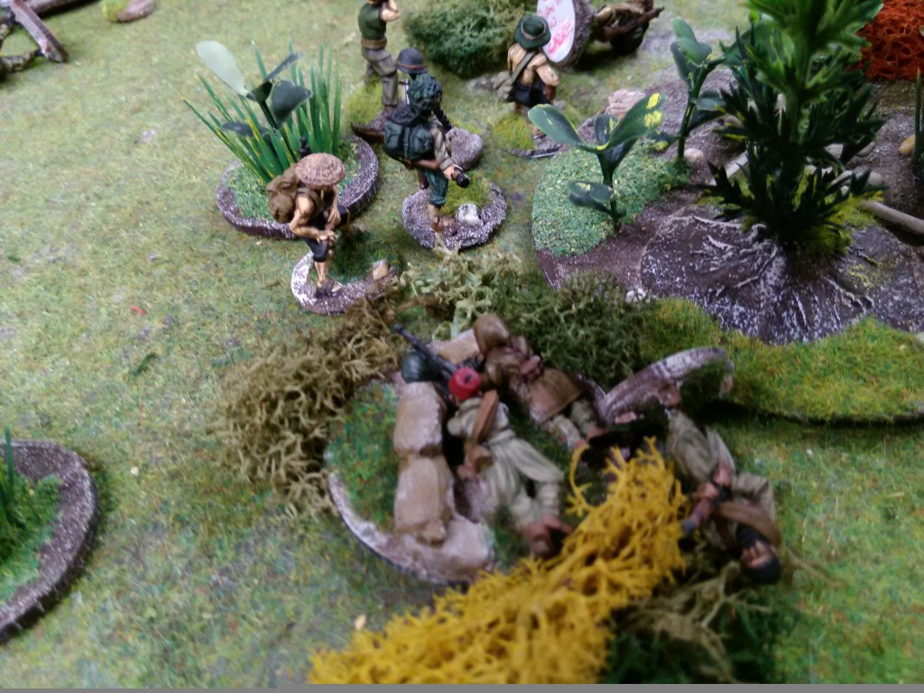 All was not over yet in the Moroccan theatre, in a bizarre turn of events the Viet Minh advance had not revealed the lmg team that had been deployed by the bridge – this was partly a player thing, they simply forgot 🤣 but also a good rules thing because the distance we had allocated for vision within the jungle did indeed mean they had moved past without seeing and so the Moroccans redeployed and opened up. A couple of the Viet Minh went down in the initial burst and it did distract from some of the firing on Antonin and his men but quick thinking Corporal To Van Phu lobbed a well thrown grenade and the lmg was history. Just to complete the theatre of this mini battle the two man patrol of Amar & Haza emerged from the jungle to cut down one of the lmg gunners with rifle fire but they paid the price for their intervention and were cut down in return.