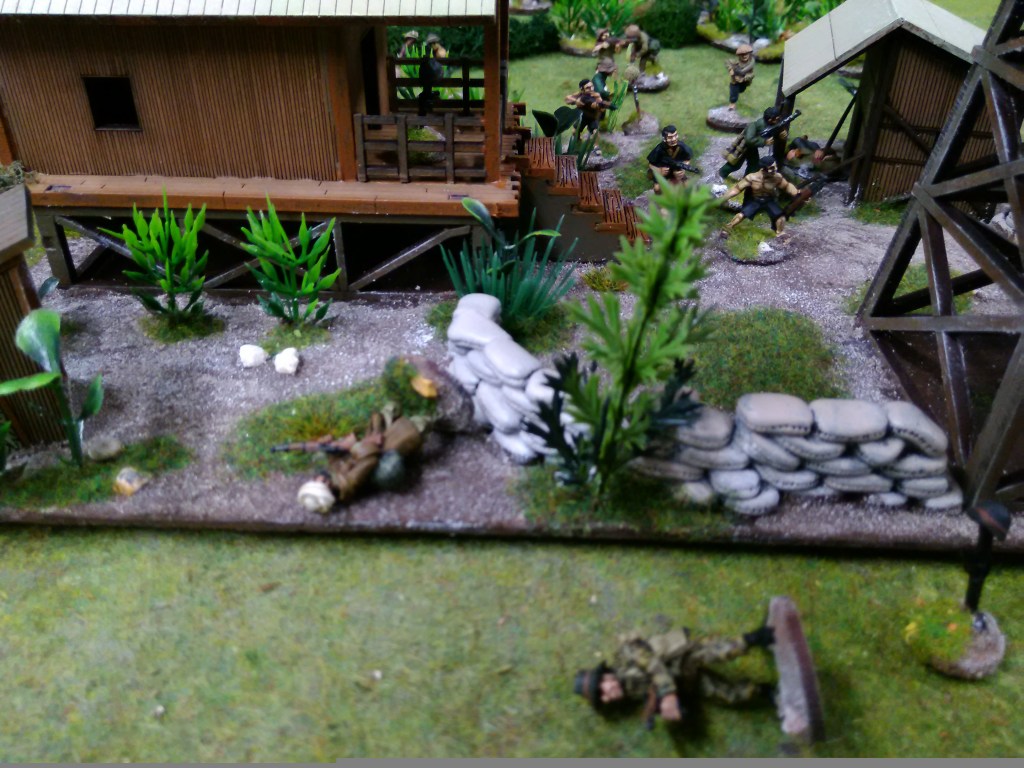 Despite the breathing space the Moroccans had gained themselves they were in fact in bigger trouble because no sooner had they hopped over the sandbags than the Support Squad finally arrived – it was a longer slog from their jump off point, and opened fire from the edge of the jungle into the backs of Antonin and his men. This was one of those classic “I forgot about them” moments and from an umpiring point of view a satisfaction with the counters idea, there had been 3 counters in this part of the play area and one had been discovered to be a dummy by the two man patrol but then concentration was lost and the Moroccans paid the price. Both Said & Ahmed were seriously wounded in the initial fusillade and later died of their wounds but Antonin survived long enough to gun down Lam Binh, one of the lmg loaders and rifle fire from privates Oman & Mohammed in the tower killed the other loader, Van Nhien. Ultimately, however, sheer weight of fire killed Antonin and silenced the tower.